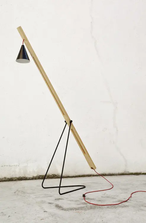With Oficina Mutante. Floor lamp made of wood, red cable and steel, height adjustable. Built at the workshop Carpintería Expandida.