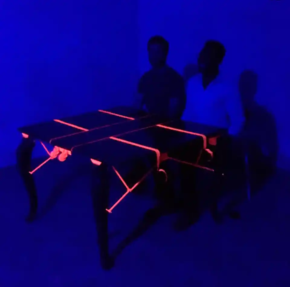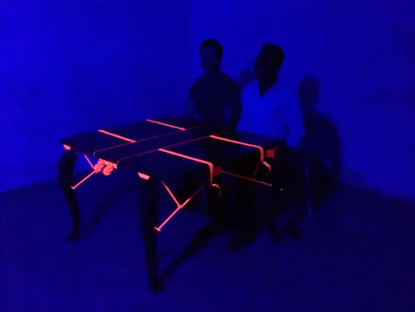 Second-hand wood table disassembled and assembled again with metal folding mechanism. Folding table for Luis Amalia performances scenography Stillframes Luis Amalia and Kace Monney in the Juan Gallery, Madrid. Luis Amalia in Espacio DT, Madrid.