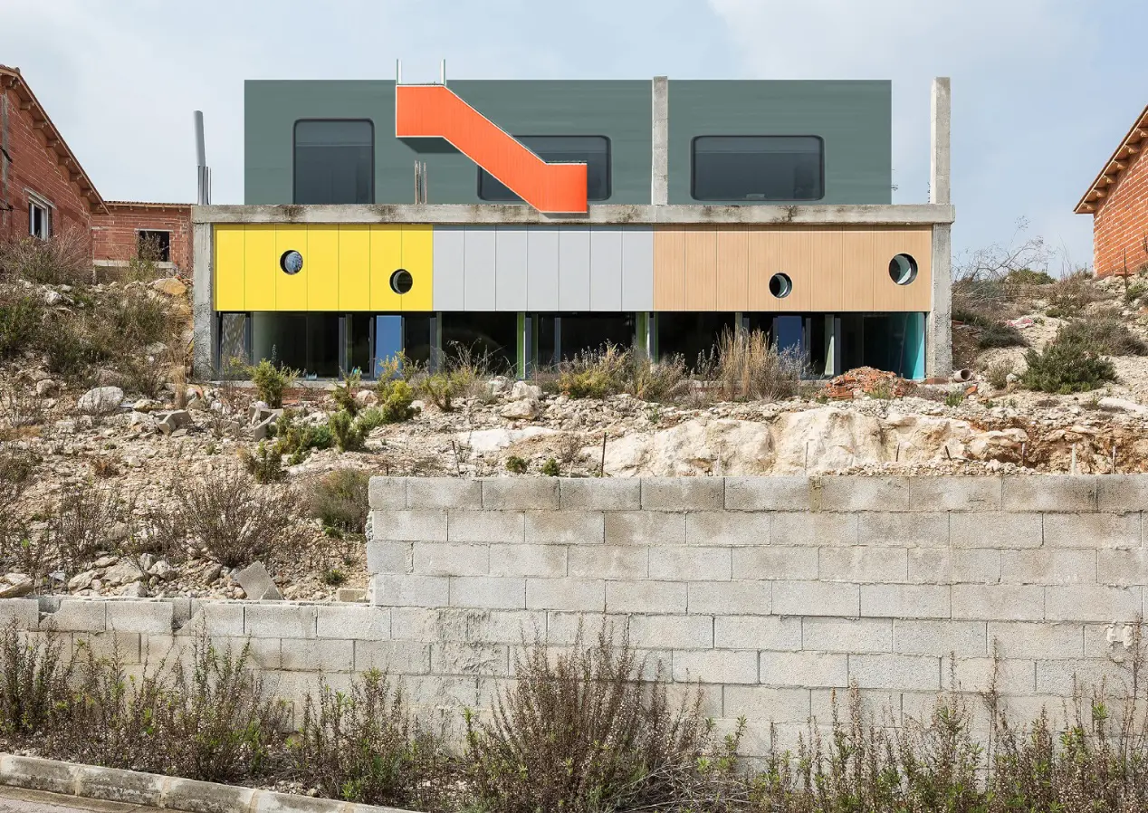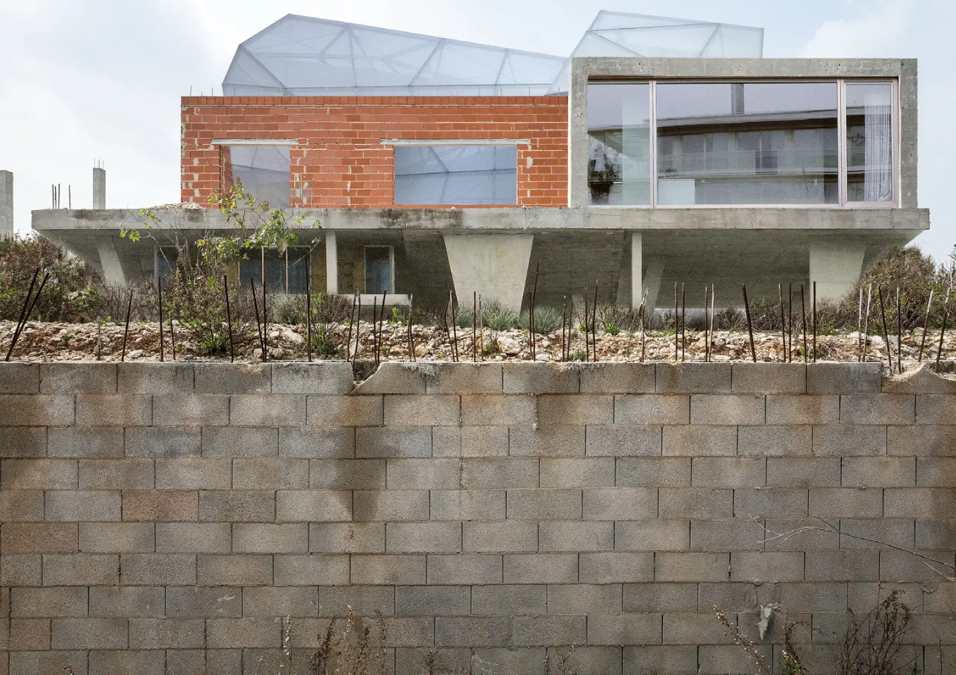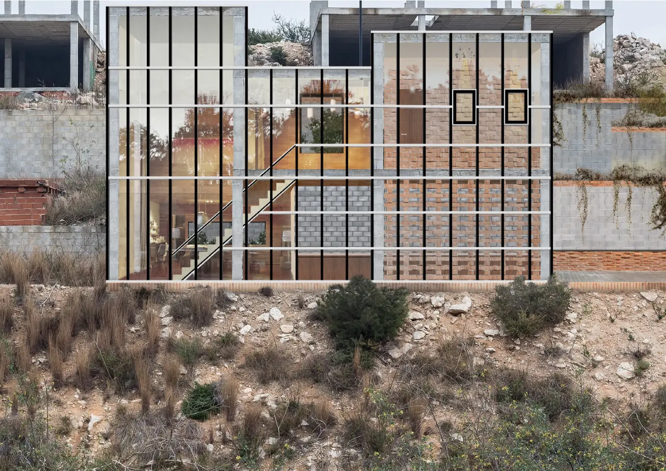 The case study is located in L’Enova, a small population of only 1000 inhabitants located 55 kilometres from Valencia. Since 2010, the landscape of this municipality of the Ribera Alta is dominated by an unfinished promotion of 75 identical houses built on top of the hill flanking the village. Today, only one of the houses is occupied and the rest appears as a temporal sequence of the different phases of its construction: from the Foundation to the Interior tiling.