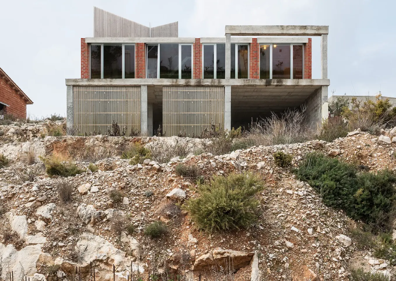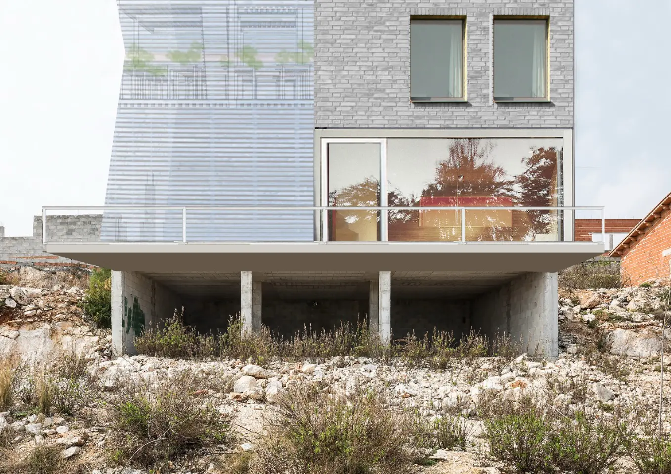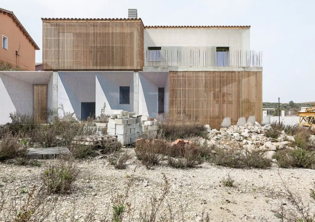 The case study is located in L’Enova, a small population of only 1000 inhabitants located 55 kilometres from Valencia. Since 2010, the landscape of this municipality of the Ribera Alta is dominated by an unfinished promotion of 75 identical houses built on top of the hill flanking the village. Today, only one of the houses is occupied and the rest appears as a temporal sequence of the different phases of its construction: from the Foundation to the Interior tiling.